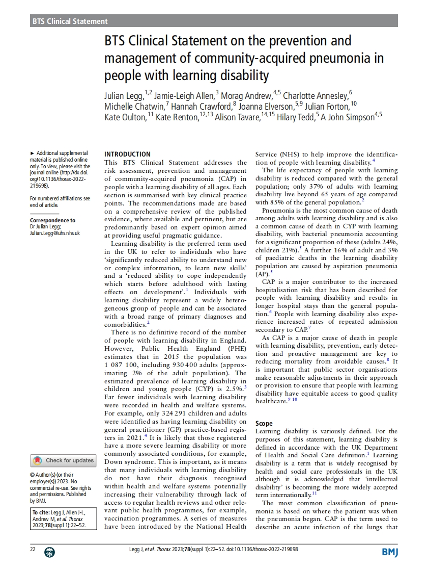 BTS临床声明:学习障碍人群社区获得性肺炎的预防和管理