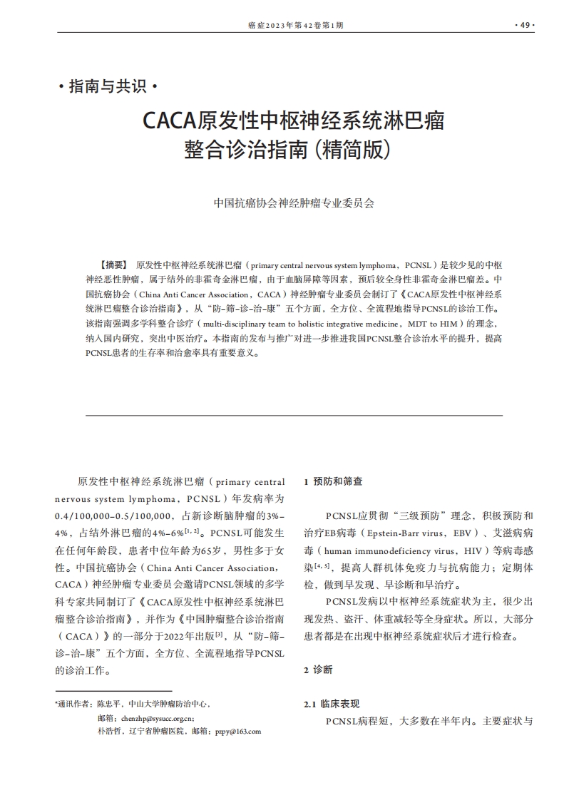 CACA原发性中枢神经系统淋巴瘤整合诊治指南(精简版)