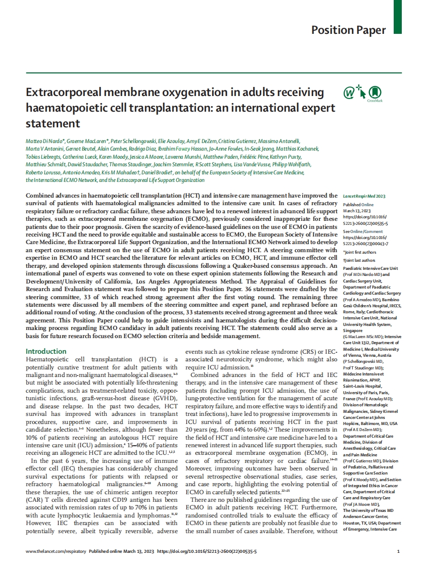 国际专家声明:成人接受造血细胞移植的体外膜肺氧合
