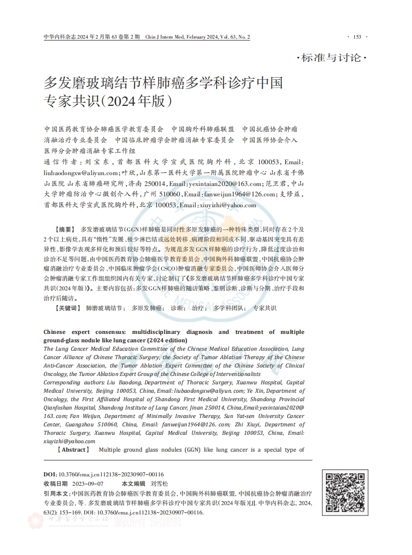 首页共识指南专家共识多发磨玻璃结节样肺癌多学科诊疗中国专家共识(2024年版)