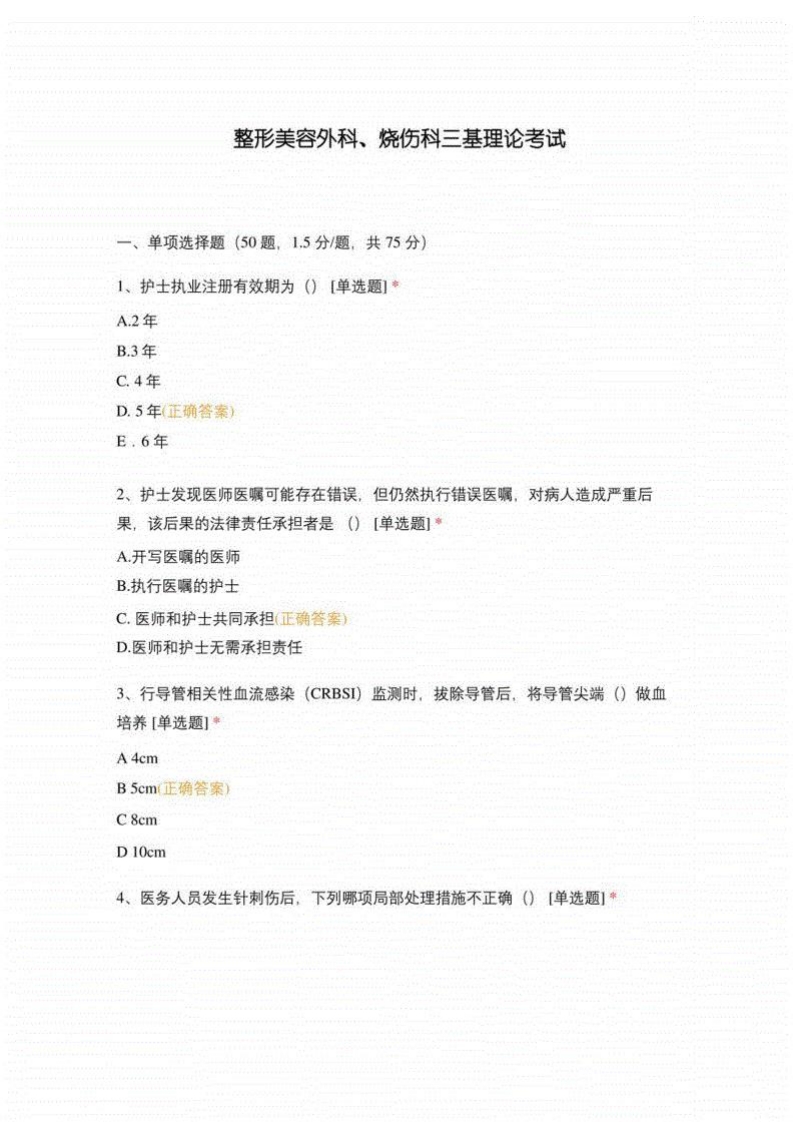 整形美容外科、烧伤科三基理论考试