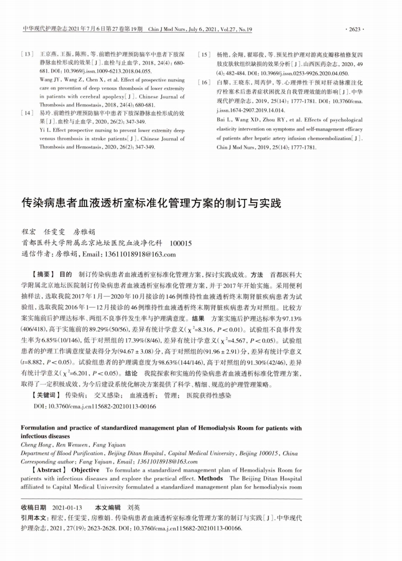传染病患者血液透析室标准化管理方案的制订与实践